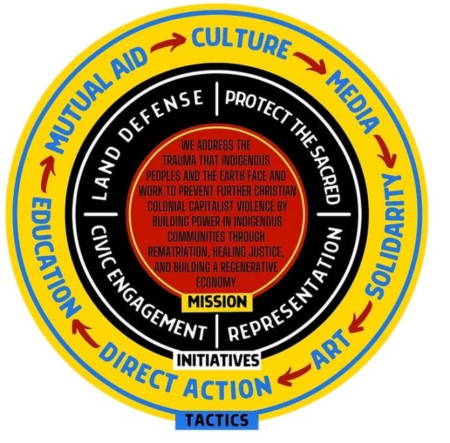 Great Plains Action Society addresses the trauma that Indigenous Peoples and the Earth face and work to prevent further christian colonial capitalist violence by fighting for and building power in Indigenous communities through reMatriation, healing justice and a regenerative economy. We believe that Indigenous ideologies and practices are the antithesis of colonial capitalism, and we deploy these tools to fight and build on our vision–tools that are deeply embedded in a culture of resistance.
