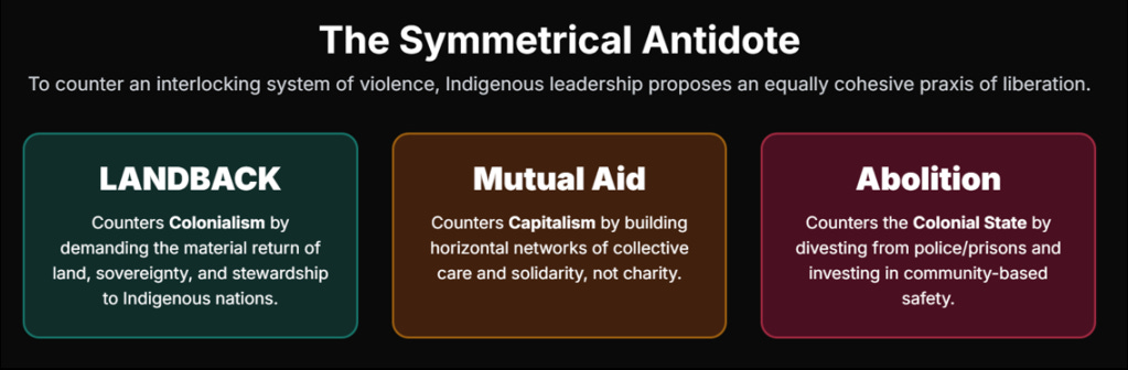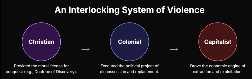 This multi-system collapse can be traced back to the arrival of European settlers on this land. Indigenous peoples refer to what happened as “Christian colonial capitalist violence.”